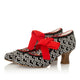 Popular hi-cut court shoe WILLOW's bold red and black polka dot velvet uppers, trimmed with a sweet red scallop edging, feature statement velvet ribbon ankle ties. Red and black satin polka-dot linings complete the retro look. WILLOW matches perfectly to Ruby Shoo bag style ALBERTA.