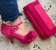You love her, so we brought her back! With fuchsia faux suede accentuated by a delicate overlaid lace-on-satin band and matching flower corsage, and lined with a pretty polka dot, this court shoe will take you to any special occasion.  Ruby Shoo CHRISSIE matches perfectly to bag style TIRANA
