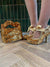 Our shoes being featured in Wicked inspired us to go SPARKLY with these sequin beauties! Popular hi-cut court shoe WILLOW's glistening gold uppers are trimmed with a pretty scallop edging and feature statement ribbon ankle ties. Quirky kitch 'women of the world' print is both fun and a nod to our woman owned, women empowering brand. Ruby Shoo WILLOW matches perfectly to Ruby Shoo bag style HOLLYWOOD